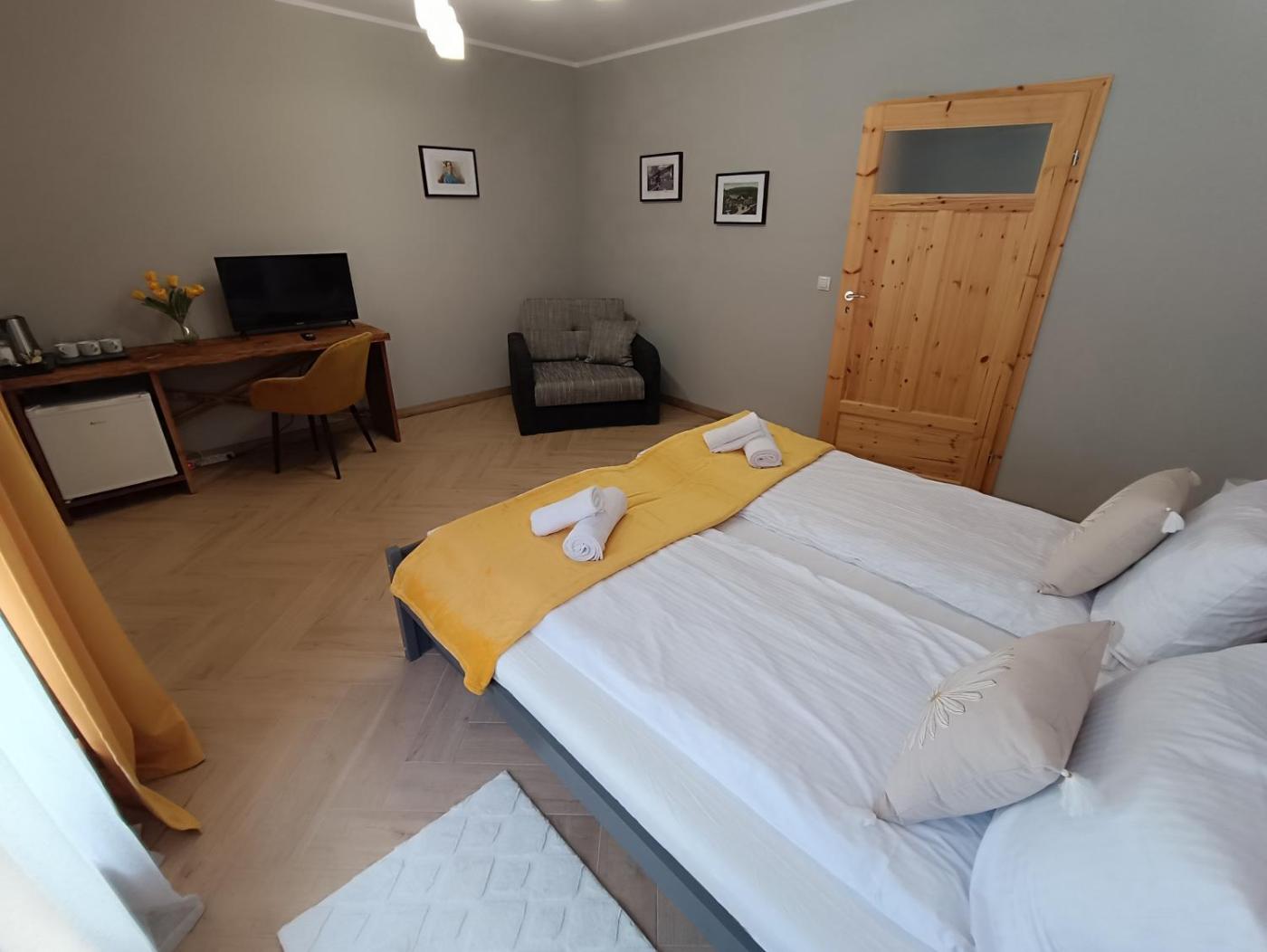 Pokój trzyosobowy. The triple room offers a private entrance, a tea and coffee maker, as well as a private bathroom featuring a shower and a hairdryer. The triple room provides a flat-screen TV, a wardrobe, a sofa, a tiled floor as well as mountain views. The unit offers 2 beds. Pokój Trzyosobowy - 3 osobowy. Powierzchnia pokoju ok.: 18 mkw. ;